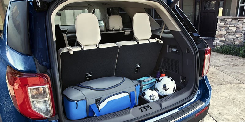 For those sitting in the third row, it's easy to get inside the Explorer because the second-row seats slide effortlessly forward. The available hands-free liftgate, which comes standard on select trims, allows you to easily load your groceries and supplies, and you have plenty of room with a maximum of 87.8 cubic feet of cargo space.