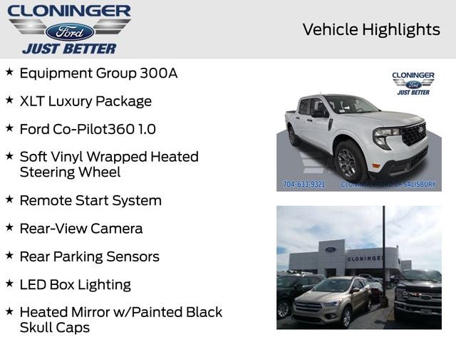 2025 Ford Maverick XLT 400W Inverter w/USB Console Rear, Auto High Beams, BLIS w/Cross-Traffic Alert, Cross Traffic Brake Assist, Equipment Group 300A, Evasive Steering Assist, Ford Co-Pilot360 1.0, Heated Mirror w/Painted Black Skull Caps, Heated Seats, Intersection Assist, Lane-Keeping System, LED Box Lighting, Power Glass Manual-Folding Mirrors, Pre-Collision Assist w/Automatic Emergency Braking, Rear Parking Sensors, Rear-View Camera, Remote Start System, Soft Vinyl Wrapped Heated Steering Wheel, XLT Luxury Package. 42/35 City/Highway MPG ++ PRICE INCLUDES ALL REBATES AND FINANCING THRU FORD MOTOR CREDIT ++ Cloninger Ford Of Salisbury Will Pay TOP $$$ FOR YOUR TRADE-IN! ++ Cloninger Ford Of Salisbury – JUST BETTER!!! ++ Better People, Better Experience !!! One Year Appearance Package $1298 Not Included In Sales Price *PAINT PROTECTION Protects against fading, weather induced cracking or peeling, oxidation or loss of gloss. *FABRIC PROTECTION Protects against any normal oil-or water-based spills on the fabric. *VINYL & LEATHER PROTECTION Protects against fading and permanent staining caused by food or drink. Price includes: $1000 - Retail Customer Cash. Exp. 03/31/2026