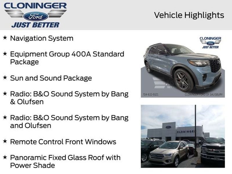 2026 Ford Explorer ST Equipment Group 400A Standard Package, Multicontour Seats with Front Active Motion, Navigation System, Panoramic Fixed Glass Roof with Power Shade, Radio: B&O Sound System by Bang & Olufsen, Radio: B&O Sound System by Bang and Olufsen, Remote Control Front Windows, Sun and Sound Package, Wheels: 21 Magnetite-Painted Aluminum. ++ PRICE INCLUDES ALL REBATES AND FINANCING THRU FORD MOTOR CREDIT ++ Cloninger Ford Of Salisbury Will Pay TOP $$$ FOR YOUR TRADE-IN! ++ Cloninger Ford Of Salisbury – JUST BETTER!!! ++ Better People, Better Experience !!! One Year Appearance Package $1298 Not Included In Sales Price *PAINT PROTECTION Protects against fading, weather induced cracking or peeling, oxidation or loss of gloss. *FABRIC PROTECTION Protects against any normal oil-or water-based spills on the fabric. *VINYL & LEATHER PROTECTION Protects against fading and permanent staining caused by food or drink. Price includes: $3500 - Retail Customer Cash. Exp. 03/31/2026