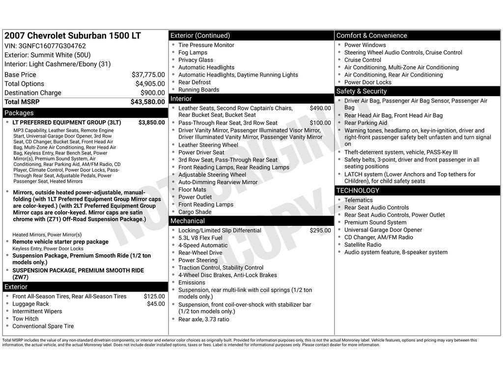 2007 Chevrolet Suburban 1500 LT - a well-maintained, low-mileage example located in Florence, SC. This full-size SUV pairs a proven V8 5.3L Gasoline/E85 engine with rear-wheel drive, delivering strong towing capability and confident on-road performance. With just 0 miles recorded (certified low mileage), this Chevrolet Suburban offers the rugged utility and passenger comfort that have made this model a long-standing favorite. Inside, the Chevrolet Suburban LT is appointed for convenience and entertainment. Features include Remote Start for easy climate control, Rear Parking Sensors to aid maneuvering in tight spaces, and a premium BOSE stereo system for exceptional audio quality. Satellite Radio and XM Radio are included for extensive listening options during every drive. Spacious seating and abundant cargo capacity make this SUV ideal for families, road trips, or work transport. Built with durable materials and thoughtful design, this Chevrolet Suburban balances functionality with comfort: comfortable seating, multiple storage solutions, and intuitive controls for daily usability. Safety and driver assistance elements like the rear sensors help provide extra confidence when parking or reversing. Located in Florence, SC, this vehicle is ready for inspection and test drives by serious buyers. For more information, to schedule an appointment, or to request a detailed history and inspection report, please contact us - we're happy to assist with any questions about this low-mileage 2007 Chevrolet Suburban 1500 LT.