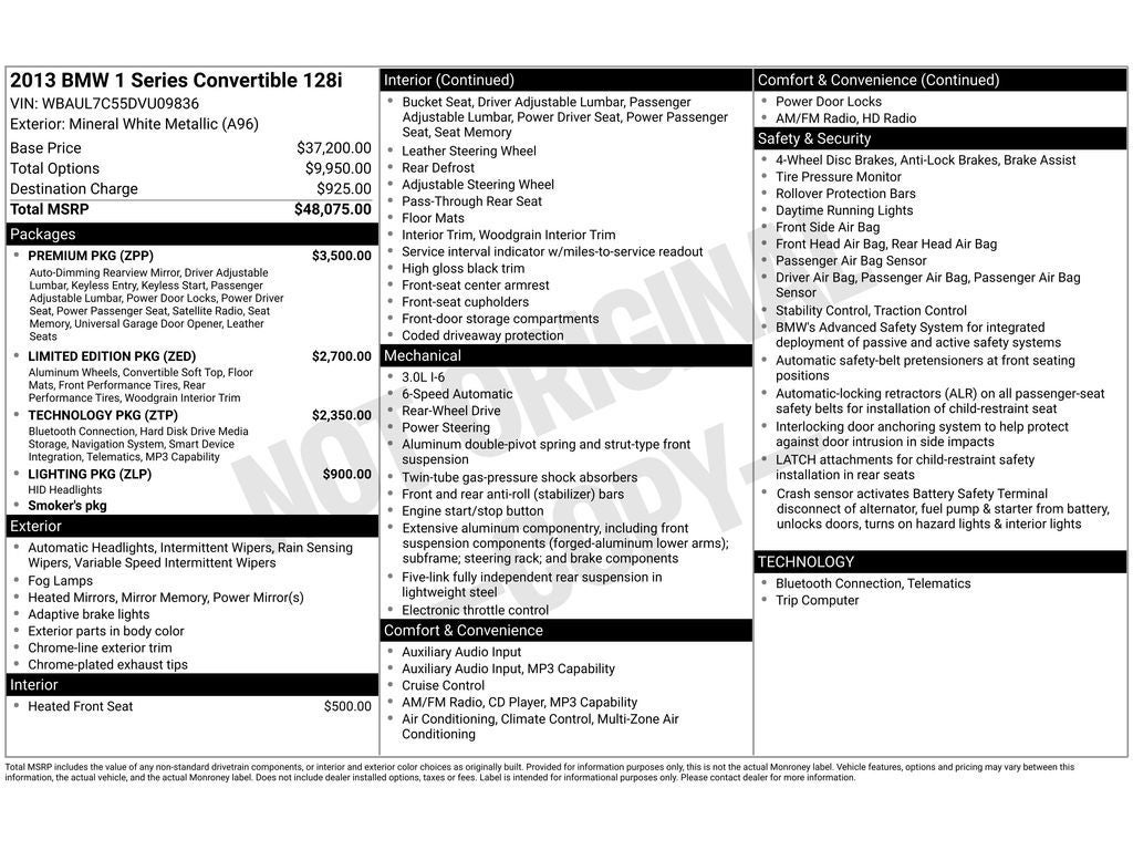 This vehicle has a clean CARFAX vehicle history report. This 2013 BMW 1 series offers Automatic Climate Control for personalized comfort. The leather seats in it are a must for buyers looking for comfort, durability, and style. This unit features a hands-free Bluetooth® phone system. The satellite radio system in this vehicle gives you access to hundreds of nation-wide radio stations with a clear digital signal. This BMW 1 series has a 6 Cyl, 3.0L high output engine. Quickly unlock the vehicle with keyless entry. Enjoy the incredible handling with the rear wheel drive on this model. This BMW 1 series embodies class and sophistication with its refined white exterior. Maintaining a stable interior temperature in it is easy with the climate control system. This BMW 1 series is accented with premium quality alloy wheels. This unit features cruise control for long trips. The Electronic Stability Control will keep you on your intended path.