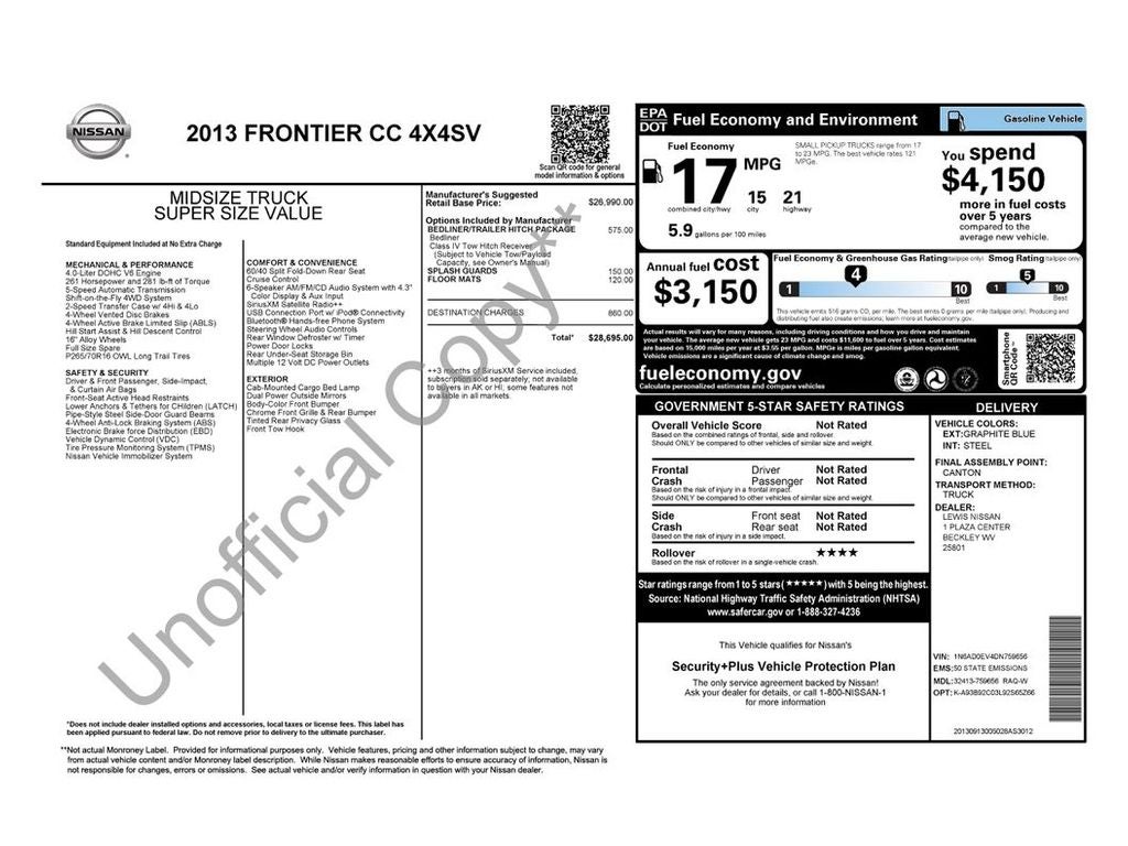 Call or visit to schedule a test drive in Florence and experience the V6 power and 4WD confidence firsthand. Financing options available for qualified buyers. Don't miss this opportunity to own a well-maintained 2013 Nissan Frontier SV at an unbeatable value in Florence, SC.