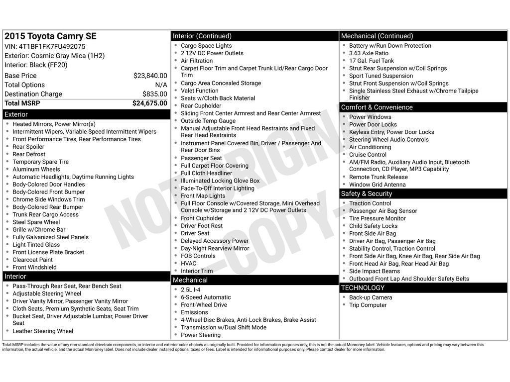 For sale in Florence, SC: a reliable 2015 Toyota Camry SE with FWD and a fuel-efficient 2.5L 4-cylinder gasoline engine. This well-maintained Toyota Camry blends comfort, sporty styling, and strong Toyota dependability - priced to be the best value in the area for discerning buyers seeking quality and savings. Inside, enjoy leather seats that provide a refined ride for daily commutes or longer trips. The hands-free Bluetooth® connectivity keeps you safely connected on the go for calls and music streaming. A back-up camera enhances visibility while reversing, making parking and tight maneuvers easier and safer. This vehicle also includes a CARFAX Clean Report, reflecting a straightforward ownership history you can trust. Performance-wise, the 2.5L 4-cylinder offers an efficient balance of power and fuel economy, and the front-wheel-drive layout provides confident handling in varying road conditions. Whether you want a dependable commuter, a family sedan, or a comfortable vehicle for weekend travel, this Toyota Camry SE checks the boxes. Located in Florence, SC, this 2015 Toyota Camry SE is competitively priced to move quickly. Contact us today to schedule a test drive and see why this Toyota Camry represents the best price for value, condition, and dependable Toyota engineering in the Florence market.