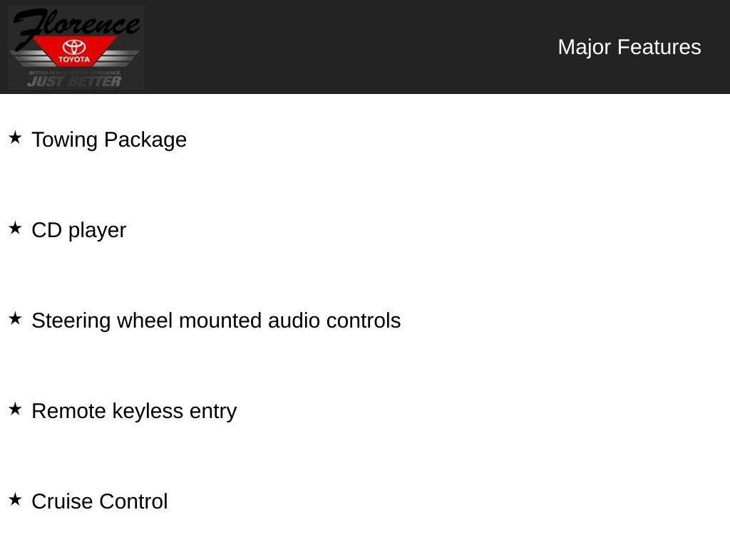 At Florence Toyota come see how our USED CARS are JUST BETTER . We offer the following benefits: Lifetime Power Train (Some exclusions apply), 1st Year Maintenance, $500 Additional Trade In Appraisal, 72 Hour Vehicle Exchange Program, Yearly Vehicle Appraisal & Safety Inspection, VIP Loyalty Program, Routine Express Service, Courtesy Service Shuttle, Express Buying Service. Also, as an added benefit we will buy your vehicle even if you don't buy ours!! Call today (866)830-0793or visit us at www.florencetoyota.com *Customer must trade-in a vehicle to receive $1,000 Trade Assist credit that is included in the online price. **Financing must be provided by a third-party lender using this dealership’s assistance for Customer to receive $1,000 Financing Assist credit that is included in the online price. See dealer for complete details.