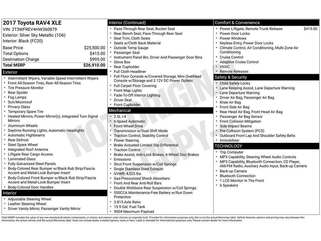 Good News! This certified CARFAX 1-owner vehicle has only had one owner before you. This vehicle features a hands-free Bluetooth® phone system. Protect this 2017 Toyota RAV4 from unwanted accidents with a cutting edge backup camera system. It has auto-adjust speed for safe following. This Toyota RAV4 offers Automatic Climate Control for personalized comfort. This small suv is front wheel drive. This 2017 Toyota RAV4 shines with an exquisite metallic silver exterior finish. Load groceries and much more with ease into this small suv thanks to the power liftgate. This unit has a 4 Cyl, 2.5L high output engine. Set the temperature exactly where you are most comfortable in the vehicle. The fan speed and temperature will automatically adjust to maintain your preferred zone climate. This Toyota RAV4 has fog lights for all weather conditions. The vehicle has an automatic transmission. It features cruise control for long trips. Electronic Stability Control is one of many advanced safety features on this Toyota RAV4.