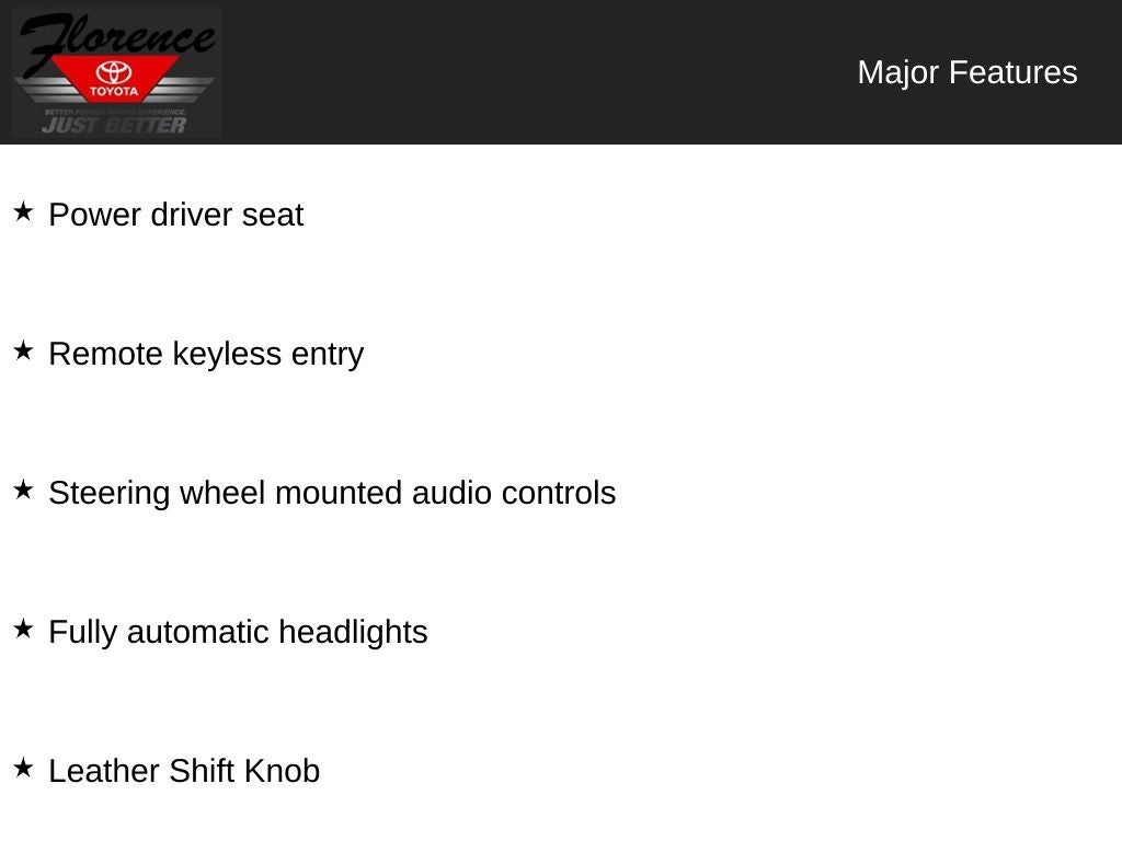 At Florence Toyota come see how our USED CARS are JUST BETTER . We offer the following benefits: Lifetime Power Train (Some exclusions apply), 1st Year Maintenance, $500 Additional Trade In Appraisal, 72 Hour Vehicle Exchange Program, Yearly Vehicle Appraisal & Safety Inspection, VIP Loyalty Program, Routine Express Service, Courtesy Service Shuttle, Express Buying Service. Also, as an added benefit we will buy your vehicle even if you don't buy ours!! Call today (866)830-0793or visit us at www.florencetoyota.com *Customer must trade-in a vehicle to receive $1,000 Trade Assist credit that is included in the online price. **Financing must be provided by a third-party lender using this dealership’s assistance for Customer to receive $1,000 Financing Assist credit that is included in the online price. See dealer for complete details.