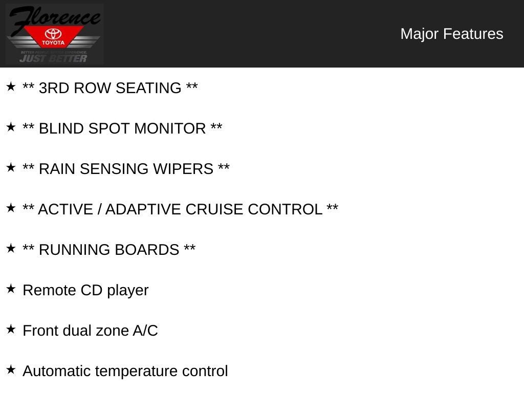 At Florence Toyota, we are committed to providing our customers with the best possible experience. Come see how our USED CARS are JUST BETTER. We offer the following benefits: Lifetime Power Train (Some exclusions apply), 1st Year Maintenance, $500 Additional Trade In Appraisal, 72 Hour Vehicle Exchange Program, Yearly Vehicle Appraisal & Safety Inspection, VIP Loyalty Program, Routine Express Service, Courtesy Service Shuttle, Express Buying Service. Also, as an added benefit we will buy your vehicle even if you don't buy ours!! Call today (866)830-0793 or visit us at www.florencetoyota.com *Customer must trade-in a vehicle to receive $1,000 Trade Assist credit that is included in the online price. **Financing must be provided by a third-party lender using this dealership's assistance for Customer to receive $1,000 Financing Assist credit that is included in the online price. See dealer for complete details.