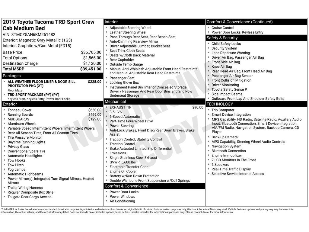 You'll never again be lost in a crowded city or a country region with the navigation system on this 2019 Toyota Tacoma . Our dealership has already run the CARFAX report and it is clean. A clean CARFAX is a great asset for resale value in the future. This small pickup features a hands-free Bluetooth® phone system. See what's behind you with the back up camera on this small pickup. This 2019 Toyota Tacoma projects refinement with a racy metallic gray exterior. This vehicle has four wheel drive capabilities. This model has a V6, 3.5L high output engine. This unit has an automatic transmission. This 2019 Toyota Tacoma is equipped with a gasoline engine. This small pickup features cruise control for long trips. The fog lights cut through the weather so you can see what's ahead. Light weight alloy wheels on the vehicle are the perfect compliment to a stylish body.