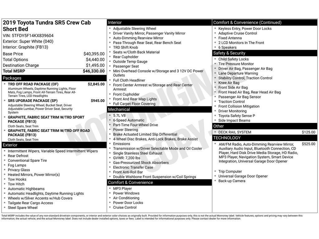 You'll never again be lost in a crowded city or a country region with the navigation system on it. Protect this 2019 Toyota Tundra from unwanted accidents with a cutting edge backup camera system. Bluetooth® technology is built into this model, keeping your hands on the steering wheel and your focus on the road. An off-road package is installed on this vehicle so you are ready for your four-wheeling best. This unit has four wheel drive capabilities. The vehicle has a V8, 5.7L high output engine. A trailer braking system is already installed on this model. This 2019 Toyota Tundra shines with clean polished lines coated with an elegant white finish. This vehicle is accented with premium quality alloy wheels. The Electronic Stability Control will keep you on your intended path. It is built for driving comfort with a telescoping wheel. This vehicle features cruise control for long trips. The fog lights cut through the weather so you can see what's ahead.