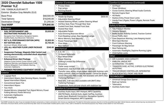 12-Volt Auxiliary Power Outlet (5), 170 Amp Alternator, 1st & 2nd Row Color-Keyed Carpeted Floor Mats, 2-Speed Active Electronic AutoTrac Transfer Case, 3.23 Rear Axle Ratio, 3rd Row 60/40 Power Fold Split-Bench, 4-Wheel Antilock Disc Brakes, 6-Way Power Front Passenger Seat Adjuster, All-Weather Floor Liner Package (LPO), Auto-Dimming Inside Rear-View Mirror, Automatic Emergency Braking, Black Assist Steps, Black Beltline Moldings, Black Mirror Caps, Black Nameplate Badging, Black Roof Rails, Body-Color Door Handles, Body-Color Headlamp Accents, Color-Keyed Carpeting Floor Covering, Driver Inboard & Front Passenger Airbags, Electronic Cruise Control w/Set & Resume Speed, Enhanced Driver Alert Package, Floor Console w/Storage Area, Fog Lamps, Forward Collision Alert, Front & Rear Black Bow Ties, Front & Rear Park Assist, Hands-Free Power Liftgate, HD Radio, Heated 2nd Row Outboard Seats, Heated Leather Wrapped Steering Wheel, Integrated Trailer Brake Controller, IntelliBeam w/Automatic High Beam On/Off, Lane Change Alert w/Side Blind Zone Alert, Lane Keep Assist w/Lane Departure Warning, Magnetic Ride Control Suspension Package, Memory Settings, Navigation System, Passive Entry System, Power Folding & Adjustable Heated Outside Mirrors, Power Release 2nd Row Bucket Seats, Power Tilt & Telescoping Steering Column, Power Tilt-Sliding Sunroof w/Express-Open/Close, Power-Adjustable Accelerator & Brake Pedals, Preferred Equipment Group 1LZ, Push Button Keyless Start, Rear Cross Traffic Alert, Rear Seat Entertainment System, Remote Vehicle Start, Roof-Mounted Luggage Rack Side Rails, RST 6.2L Performance Edition, RST Edition, Safety Alert Seat, SiriusXM Radio, Sun, Entertainment & Destinations Package, Unique Gloss Black Sport Grille, Unique RST Emblem, Universal Home Remote, Wheel Locks (Set of 4) (LPO), Wheels: 22 x 9 Gloss Black Aluminum, Wireless Charging.