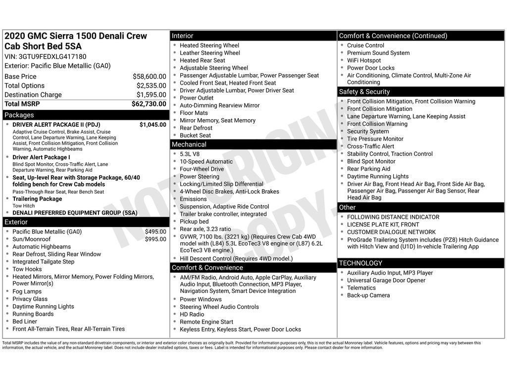 Driver Alert Package I: Ultrasonic Front and Rear Park Assist; Rear Cross Traffic Alert; Lane Change Alert with Side Blind Zone Alert. Driver Alert Package II: Forward Collision Alert; Lane Keep Assist with Lane Departure Warning; Front Pedestrian Braking; Following Distance Indicator; Automatic Emergency Braking; IntelliBeam Automatic High Beam On/off; Adaptive Cruise Control - Camera. Preferred Equipment Group 5SA: Chrome Wheel to Wheel Assist Steps; Hitch Guidance; 2 USB Ports (1st Row); Power Sliding Rear Window with Rear Defogger; Safety Alert Seat; Electric Rear-Window Defogger; Theft Deterrent System (unauthorized Entry); Signature Denali Grille; High-Capacity Air Filter; Compass; 120-Volt Instrument Panel Power Outlet; Heated Driver and Front Outboard Passenger Seating; Wireless Charging; Color-Keyed Carpeting Floor Covering; OnStar and GMC Connected Services Capable; Heated 2nd Row Outboard Seats; Power Front Passenger Windows with Express Up/down; Power Rear Windows with Express Down; Integrated Trailer Brake Controller; Ventilated Driver and Front Passenger Seats; Manual Tilt-Wheel and Telescoping Steering Column; 275/60R20SL AT BW Tires; HD Rear Vision Camera; LED Cargo Area Lighting; Remote Vehicle Starter System; Hill Descent Control; 5.3L EcoTec3 V8 Engine; Floor-Mounted Center Console; 170 Amp Alternator; 20" X 9" Multi-Dimensional Polished Aluminum Wheels; Auxiliary External Transmission Oil Cooler; Electrical Lock Control Steering Column; Trailering Package; Chrome Recovery Hooks; Adaptive Ride Control Suspension; Steering Wheel Audio Controls; GMC Connected Access Capable; Universal Home Remote; 2-Speed Transfer Case; Deep-Tinted Glass; Spray-On Pickup Bed Liner with Denali Logo; HD Radio; Premium GMC Infotainment System Radio with Navigation; Power Front Windows with Driver Express Up/down; Rear Dual USB Charging-Only Ports; Keyless Open and Start; 4G LTE Wi-Fi Hotspot Capable; ProGrade Trailering System; Rear Wheelhouse Liners; 12-Volt Rear Auxiliary Power Outlet; 2 USB Ports; Heavy-Duty Rear Locking Differential; Power Door Locks. Power Sunroof. Pacific Blue Metallic. **Equipment listed is based on original vehicle build and subject to change. Please confirm the accuracy of the included equipment by calling the dealer prior to purchase.**
