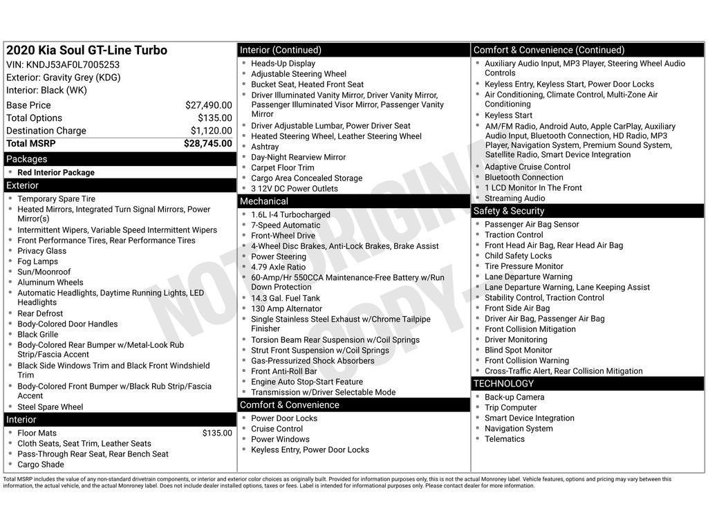 Discover confident, efficient driving with this 2020 Kia Soul GT-Line Turbo, now available in Florence, SC. Powered by a spirited 1.6L turbocharged 4-cylinder gasoline engine and front-wheel drive, this Kia Soul delivers peppy acceleration, responsive handling, and excellent fuel economy for daily commuting or weekend adventures. The sporty GT-Line trim adds a refined appearance and performance-focused touches, making it a standout in its class. Inside, you'll find premium leather seats that provide comfort and durability, along with modern connectivity features such as Apple CarPlay and Hands-Free Bluetooth® for seamless smartphone integration and safer, more convenient driving. Remote Start adds practicality—start your vehicle from a distance to warm up or cool down before you get in. Advanced safety technologies include Collision Avoidance systems designed to help reduce the risk of impact and enhance driver confidence on every trip. This 2020 Kia Soul GT-Line Turbo combines style, technology, and safety in a compact package that suits drivers who value performance and practicality. Located in Florence, SC, this vehicle is offered at the best price to provide exceptional value compared with similar models on the market. Schedule a test drive today to experience the unique blend of efficiency, comfort, and capability that this Kia Soul has to offer.