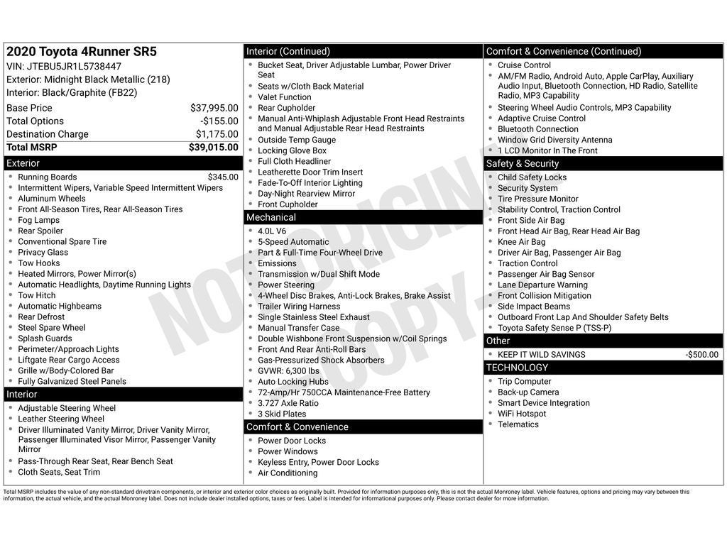 This model offers Android Auto for seamless smartphone integration. This model offers Apple CarPlay for seamless connectivity. Bluetooth® technology is built into this unit, keeping your hands on the steering wheel and your focus on the road. Our dealership has already run the CARFAX report and it is clean. A clean CARFAX is a great asset for resale value in the future. Protect this unit from unwanted accidents with a cutting edge backup camera system. It is painted with a sleek and sophisticated black color. The Toyota 4Runner has a V6, 4.0L high output engine. This unit has four wheel drive capabilities. Electronic Stability Control is one of many advanced safety features on this 2020 Toyota 4Runner . The fog lights cut through the weather so you can see what's ahead. The premium quality running boards make it easier to get in and out of this vehicle and give it a nice look too.