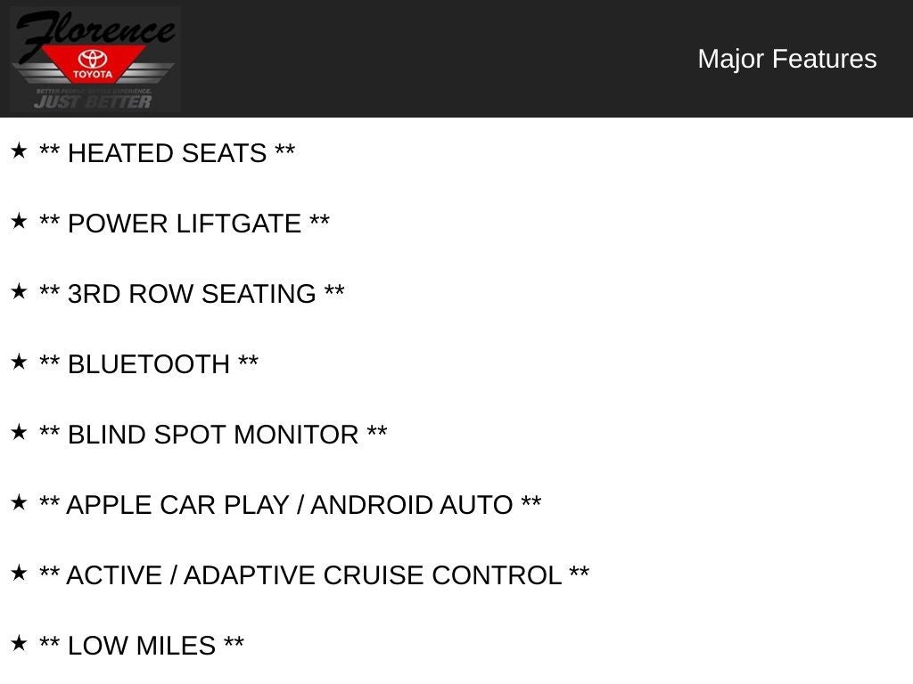 At Florence Toyota, come see how our USED CARS are JUST BETTER. We offer the following benefits: Lifetime Power Train (Some exclusions apply), 1st Year Maintenance, $500 Additional Trade In Appraisal, 72 Hour Vehicle Exchange Program, Yearly Vehicle Appraisal & Safety Inspection, VIP Loyalty Program, Routine Express Service, Courtesy Service Shuttle, Express Buying Service. Also, as an added benefit we will buy your vehicle even if you don't buy ours!! Call today (866)830-0793 or visit us at www.florencetoyota.com *Customer must trade-in a vehicle to receive $1,000 Trade Assist credit that is included in the online price. **Financing must be provided by a third-party lender using this dealership's assistance for Customer to receive $1,000 Financing Assist credit that is included in the online price. See dealer for complete details.