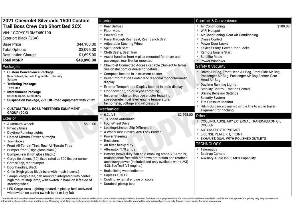 Custom Convenience Package: LED Cargo Area Lighting; EZ Lift Power Lock and Release Tailgate; Remote Vehicle Starter System; Electric Rear-Window Defogger. Preferred Equipment Group 2CX: Rear 60/40 Folding Bench Seat (folds Up); Cloth Seat Trim; Bluetooth® For Phone; 170 Amp Alternator; Compass; 40/20/40 Front Split Bench Seat; 3.5" Diagonal Monochromatic Display; Trailering Package; Standard Tailgate; Suspension Package; Color-Keyed Carpeting Floor Covering; Power Front Windows with Passenger Express Down; Remote Keyless Entry; Front Rubberized Vinyl Floor Mats; Rear Rubberized-Vinyl Floor Mats; 2-Speed Transfer Case; Deep-Tinted Glass; Electronic Cruise Control; Power Rear Windows with Express Down; Performance Red Recovery Hooks; Manual Tilt Wheel Steering Column; Power Front Windows with Driver Express Up/down; High Gloss Black Grille; Auto-Locking Rear Differential; Power Door Locks. Infotainment Package: OnStar and Chevrolet Connected Services Capable; SiriusXM Radio. 20" X 9" High Gloss Black Painted Aluminum Wheels. Single-Zone Manual/semi-Automatic Air Conditioning. **Equipment listed is based on original vehicle build and subject to change. Please confirm the accuracy of the included equipment by calling the dealer prior to purchase.**