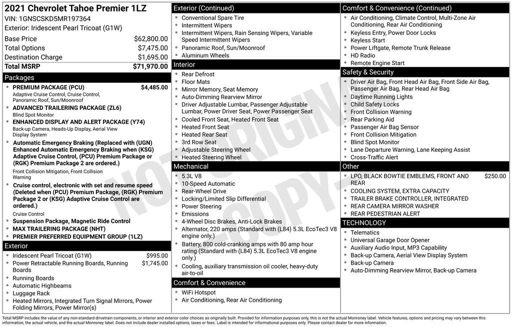 Don't miss your chance to experience the unparalleled capabilities and refined luxury of this 2021 Chevrolet Tahoe Premier. Visit our showroom today and let us demonstrate how this exceptional SUV can transform your driving experience.