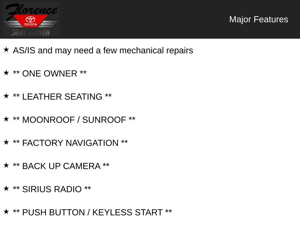 At Florence Toyota, come see how our USED CARS are JUST BETTER. We offer the following benefits: Lifetime Power Train (Some exclusions apply), 1st Year Maintenance, $500 Additional Trade In Appraisal, 72 Hour Vehicle Exchange Program, Yearly Vehicle Appraisal & Safety Inspection, VIP Loyalty Program, Routine Express Service, Courtesy Service Shuttle, Express Buying Service. Also, as an added benefit we will buy your vehicle even if you don't buy ours!! Call today (866)830-0793 or visit us at www.florencetoyota.com *Customer must trade-in a vehicle to receive $1,000 Trade Assist credit that is included in the online price. **Financing must be provided by a third-party lender using this dealership's assistance for Customer to receive $1,000 Financing Assist credit that is included in the online price. See dealer for complete details.