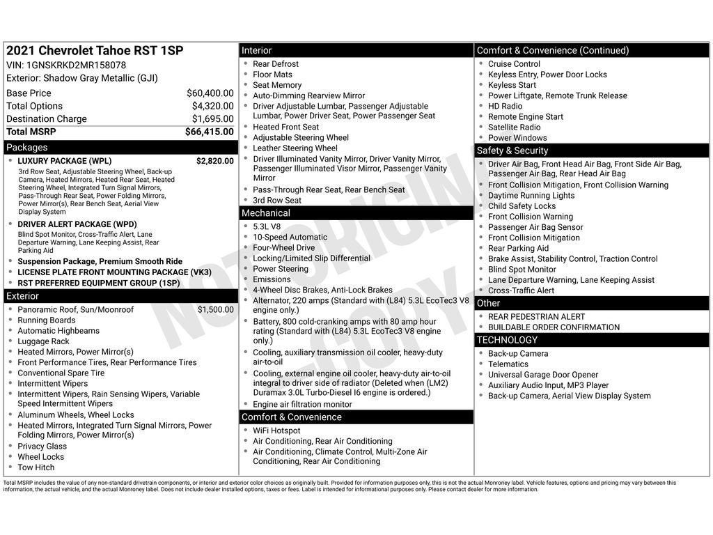 Enough room to carry all your cargo, passengers and equipment on a long road trip. Offering a ride height that is above most other vehicles, it has great visibility on the road. This model has four wheel drive capabilities. This 1/2 ton suv offers Android Auto for seamless smartphone integration. This vehicle offers Apple CarPlay for seamless connectivity. This model features a high end BOSE stereo system. Protect the Chevrolet Tahoe from unwanted accidents with a cutting edge backup camera system. Our dealership has already run the CARFAX report and it is clean. A clean CARFAX is a great asset for resale value in the future. Set the temperature exactly where you are most comfortable in this 2021 Chevrolet Tahoe . The fan speed and temperature will automatically adjust to maintain your preferred zone climate. This 1/2 ton suv features cruise control for long trips. Bluetooth® technology is built into the Chevrolet Tahoe, keeping your hands on the steering wheel and your focus on the road. Keep your hands warm all winter with a heated steering wheel in the vehicle . This model's Lane Departure Warning helps keep you in your lane. Lane Keep Assist in this Chevrolet Tahoe helps maintain safe driving by gently steering to stay within the lane. The leather seats are soft and supportive on the vehicle. With the adjustable lumbar support in this 1/2 ton suv your back will love you. Load groceries and much more with ease into it thanks to the power liftgate. Start this 2021 Chevrolet Tahoe from inside with remote start. with XM/Sirus Satellite Radio you are no longer restricted by poor quality local radio stations while driving this 2021 Chevrolet Tahoe . Anywhere on the planet, you will have hundreds of digital stations to choose from.