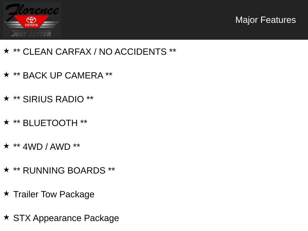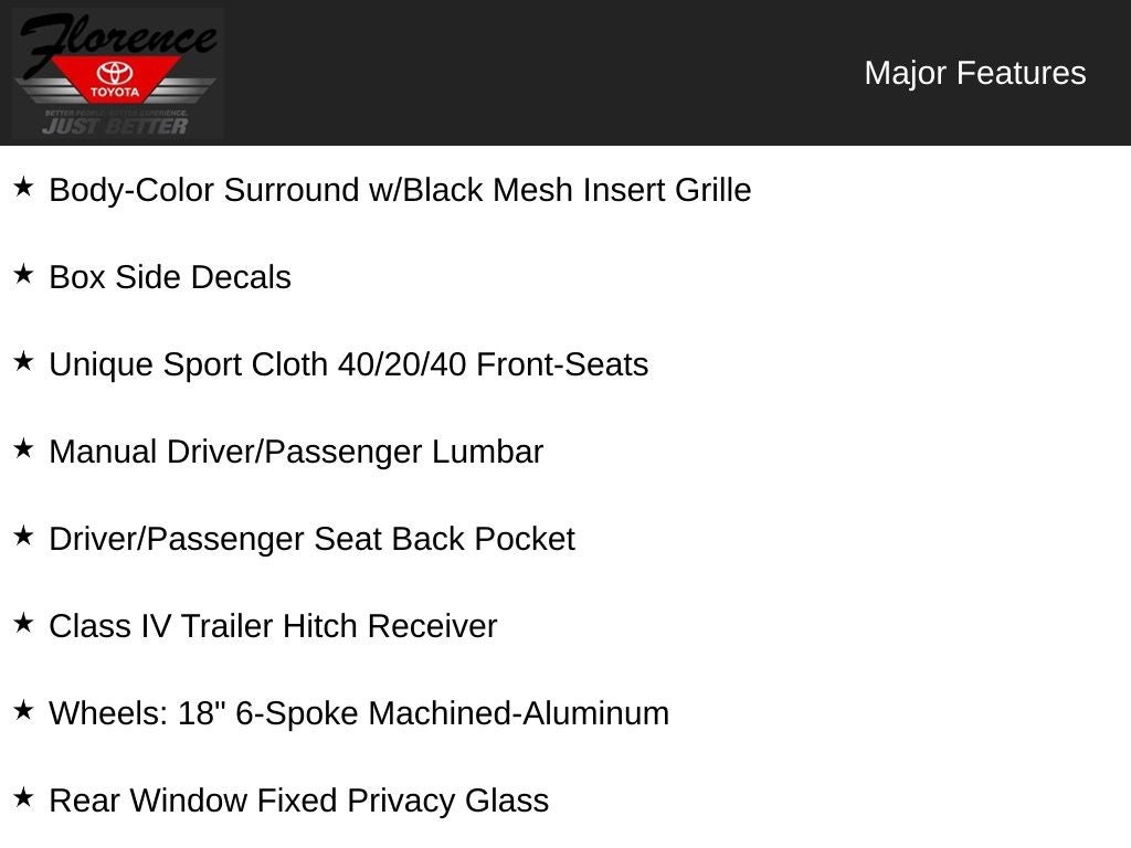 At Florence Toyota come see how our USED CARS are JUST BETTER. We offer the following benefits: Lifetime Power Train (Some exclusions apply), 1st Year Maintenance, $500 Additional Trade In Appraisal, 72 Hour Vehicle Exchange Program, Yearly Vehicle Appraisal & Safety Inspection, VIP Loyalty Program, Routine Express Service, Courtesy Service Shuttle, Express Buying Service. Also, as an added benefit we will buy your vehicle even if you don't buy ours!! Call today (866)830-0793 or visit us at www.florencetoyota.com *Customer must trade-in a vehicle to receive $1,000 Trade Assist credit that is included in the online price. **Financing must be provided by a third-party lender using this dealership's assistance for Customer to receive $1,000 Financing Assist credit that is included in the online price. See dealer for complete details.