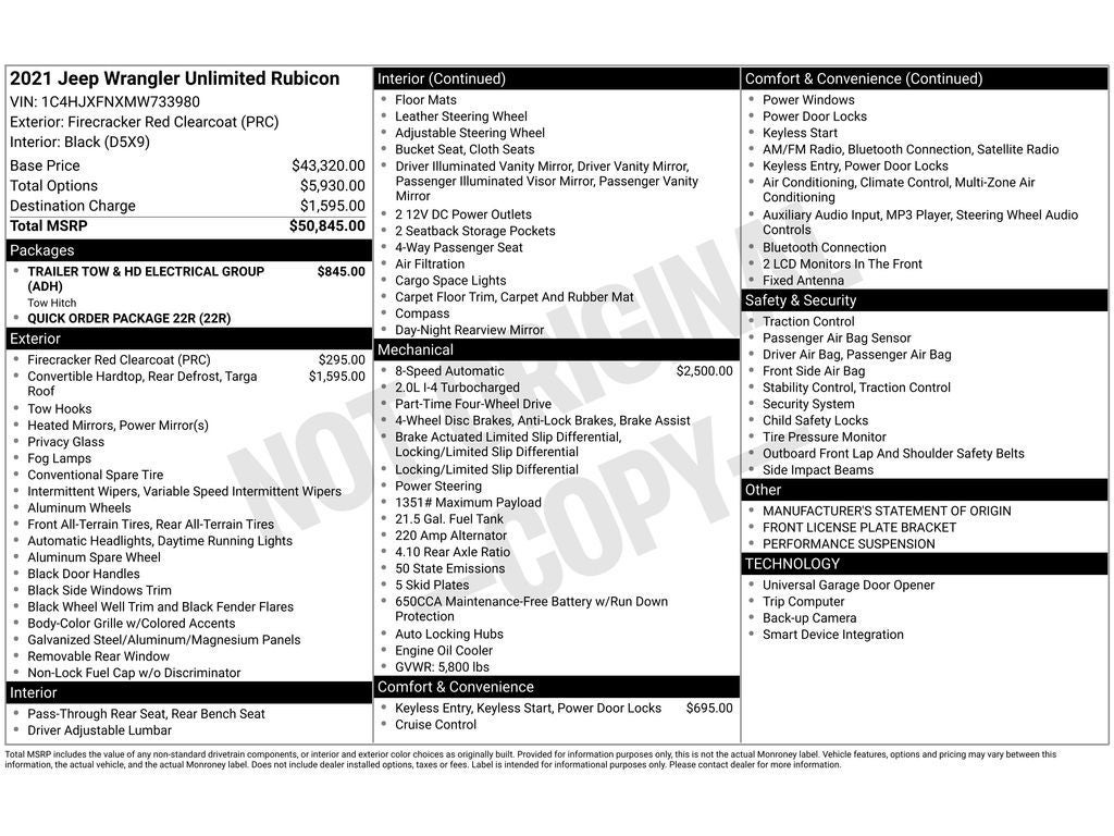 Quick Order Package 22R. Trailer Tow and Heavy Duty Electrical Group: Class II Receiver Hitch; 700 Amp Maintenance Free Battery; 7 and 4 Pin Wiring Harness; Auxiliary Switches; 240 Amp Alternator. Black 3-Piece Hard Top. Remote Proximity Keyless Entry. Firecracker Red Clearcoat. Firecracker Red Clearcoat. **Equipment listed is based on original vehicle build and subject to change. Please confirm the accuracy of the included equipment by calling the dealer prior to purchase.**