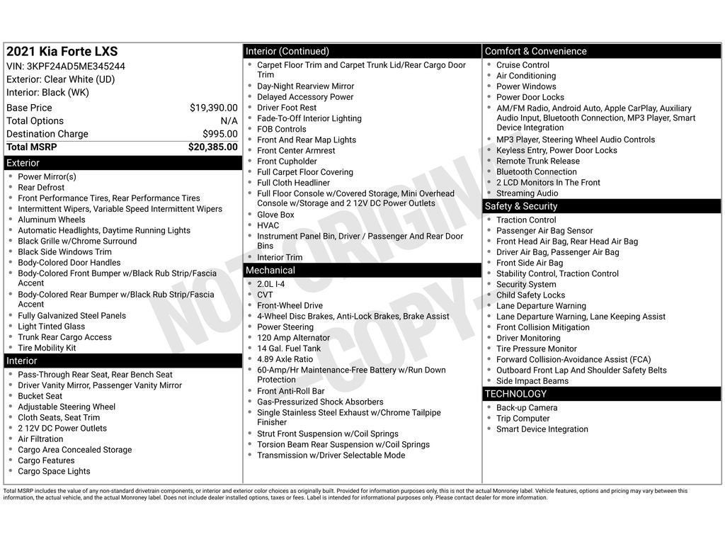 Looking for a reliable, fuel-efficient compact sedan in Florence, SC? This 2021 Kia Forte LXS with FWD and a peppy 4-cylinder 2.0L gasoline engine delivers the perfect blend of economy, comfort, and modern tech — and it's priced to move. With a CARFAX 1-Owner history and a CARFAX Clean Report, you can buy with confidence knowing this Kia Forte has been well maintained. Inside, enjoy seamless smartphone integration via Apple CarPlay and Hands Free Bluetooth® for calls and audio streaming. Safety and convenience are enhanced by a Back-Up Camera, making parking and reversing easy in tight spaces. The cabin offers smart ergonomics, supportive seats, and a straightforward infotainment layout that keeps drivers connected without distraction. This Kia Forte LXS stands out in the Florence market for its combination of low operating costs, dependable Kia engineering, and a clean vehicle history. Whether you commute daily, run weekend errands, or need a dependable first car, this model's responsive 2.0L engine and smooth FWD handling make every drive enjoyable. We're offering the best price on this excellent example — great value paired with peace of mind from its one-owner CARFAX report. Schedule a test drive in Florence, SC today and experience the comfort, technology, and value of this 2021 Kia Forte LXS. Act now — at this price it won't last long.