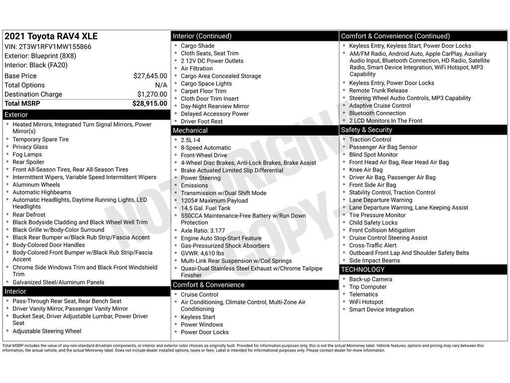 The Toyota RAV4 offers Automatic Climate Control for personalized comfort. See what's behind you with the back up camera on this model. This unit comes equipped with Android Auto for seamless smartphone integration on the road. This 2021 Toyota RAV4 features a hands-free Bluetooth® phone system. This 2021 Toyota RAV4 's Cross-Traffic Alert: Safeguarding you from unexpected traffic when reversing. This 2021 Toyota RAV4 offers Apple CarPlay for seamless connectivity. This small suv has a 4 Cyl, 2.5L high output engine. It shines with an exquisite blue finish. Set the temperature exactly where you are most comfortable in this 2021 Toyota RAV4 . The fan speed and temperature will automatically adjust to maintain your preferred zone climate. Front wheel drive on this small suv gives you better traction and better fuel economy. Easily set your speed in this unit with a state of the art cruise control system. Increase or decrease velocity with the touch of a button.