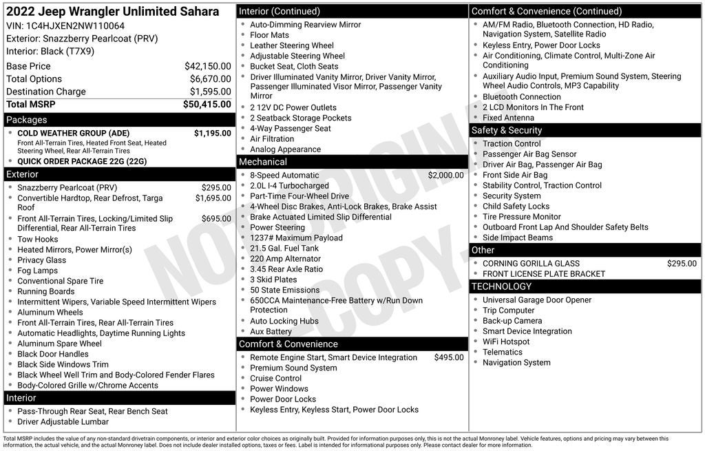 Cold Weather Group: Remote Start System; 255/70R18 All-Terrain Tires; Heated Front Seats; Heated Steering Wheel; Goodyear Brand Tires. Quick Order Package 22G. Quick Order Package 23G. Black 3-Piece Hard Top. Anti-Spin Differential Rear Axle. Remote Start System. Corning Gorilla Glass. Snazzberry Pearlcoat. **Equipment listed is based on original vehicle build and subject to change. Please confirm the accuracy of the included equipment by calling the dealer prior to purchase.**