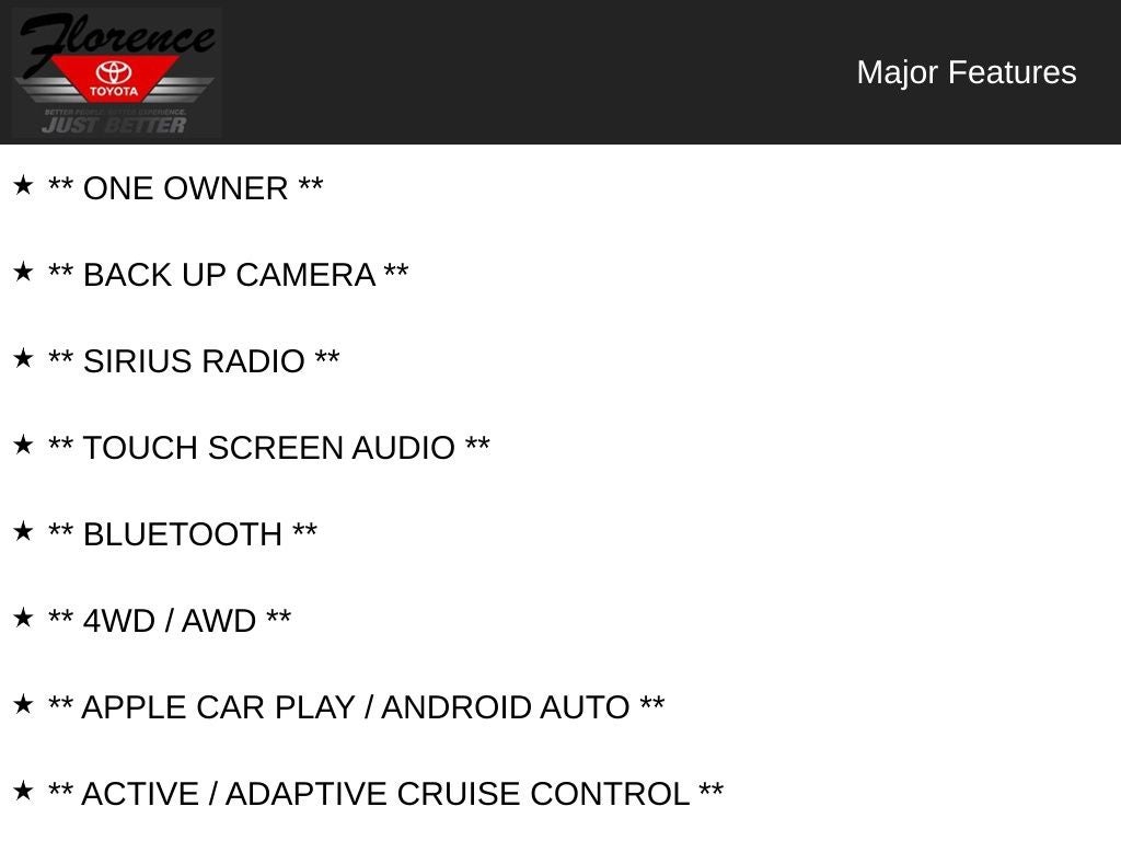 Discover rugged reliability with this 2022 Toyota 4Runner SR5, located in Florence, SC. With only 49,646 miles, this Toyota 4Runner blends legendary Toyota durability with modern convenience. Powered by a proven V6 4.0L gasoline engine and equipped with 4WD, it's ready for weekend adventures, tow duty, or daily driving with confidence. This SR5 trim features tech and safety essentials including Apple CarPlay and Android Auto for seamless smartphone integration, Hands-Free Bluetooth® for safe calls on the go, and a Back-Up Camera to simplify parking and hitching trailers. The vehicle's CARFAX 1-Owner history provides added peace of mind, reflecting careful ownership and consistent maintenance. Inside you'll find a spacious cabin built for comfort and utility-durable materials, supportive seating, and ample cargo space make it ideal for families, outdoor enthusiasts, and commuters alike. The Toyota 4Runner's body-on-frame construction and high ground clearance make it capable on rough trails while providing a composed ride on highways around Florence and beyond. This 2022 Toyota 4Runner SR5 is a standout choice for buyers seeking a capable, well-equipped SUV with low miles and a clean ownership record. Schedule a test drive in Florence, SC to experience its V6 power, 4WD capability, and modern connectivity features firsthand. Don't miss this chance to own a dependable, adventure-ready Toyota 4Runner.
