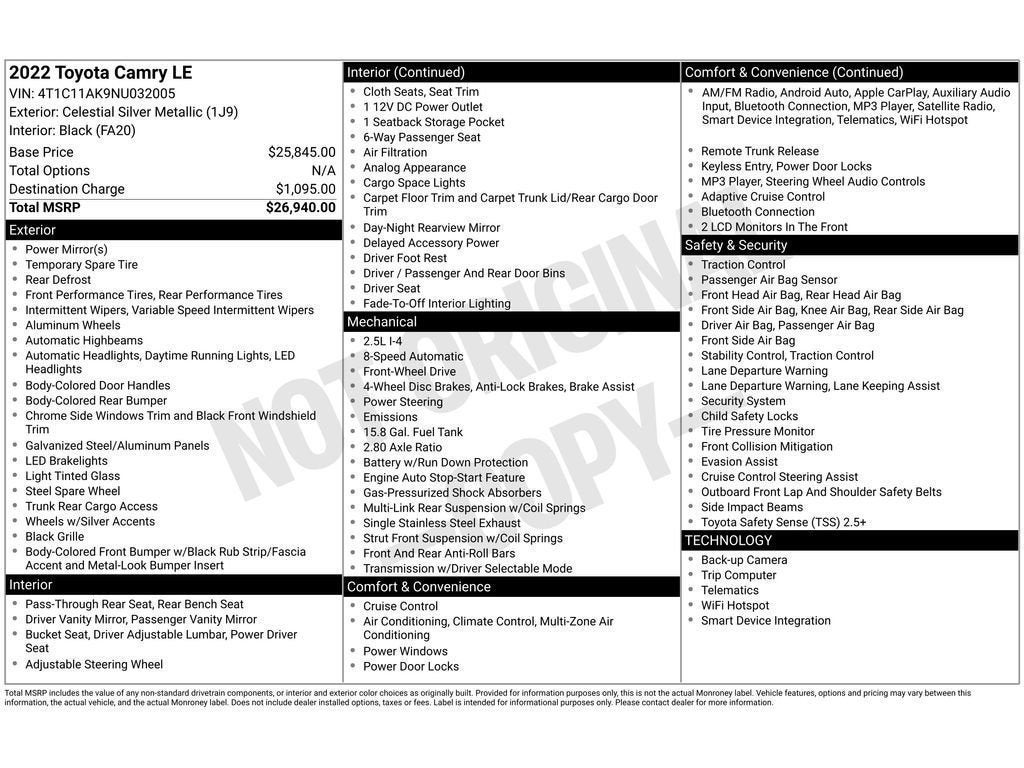 The Toyota Camry's refined interior, responsive handling, and excellent fuel economy make it a practical daily driver, while thoughtful features add convenience and enjoyment. Whether you value cost-effective commuting, advanced connectivity, or a solid resale profile, this 2022 Toyota Camry LE delivers. Located in Florence, SC, this low-mileage Toyota Camry presents a rare opportunity to own a meticulously cared-for sedan at a remarkably competitive price. Schedule a test drive today and see why this Toyota Camry represents a smart, value-driven choice for buyers who want modern features, reliable performance, and a clean vehicle history.