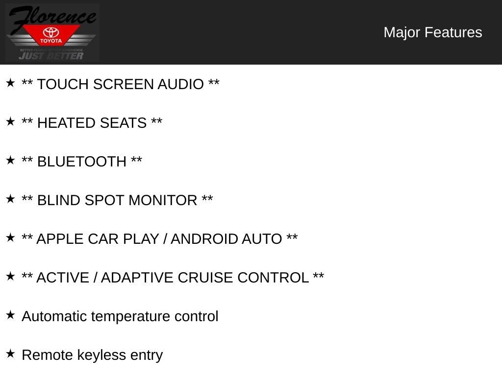 At Florence Toyota, come see how our USED CARS are JUST BETTER. We offer the following benefits: Lifetime Power Train (Some exclusions apply), 1st Year Maintenance, $500 Additional Trade In Appraisal, 72 Hour Vehicle Exchange Program, Yearly Vehicle Appraisal & Safety Inspection, VIP Loyalty Program, Routine Express Service, Courtesy Service Shuttle, Express Buying Service. Also, as an added benefit we will buy your vehicle even if you don't buy ours!! Call today (866)830-0793 or visit us at www.florencetoyota.com *Customer must trade-in a vehicle to receive $1,000 Trade Assist credit that is included in the online price. **Financing must be provided by a third-party lender using this dealership's assistance for Customer to receive $1,000 Financing Assist credit that is included in the online price. See dealer for complete details.