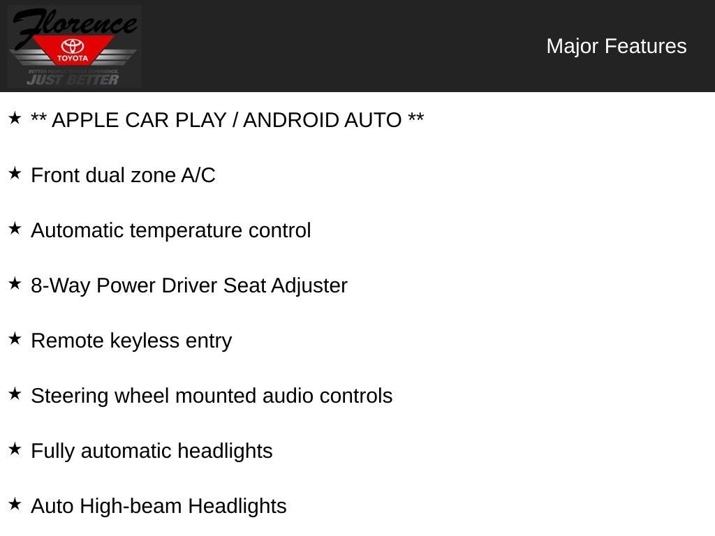 At Florence Toyota, come see how our USED CARS are JUST BETTER. We offer the following benefits: Lifetime Power Train (Some exclusions apply), 1st Year Maintenance, $500 Additional Trade In Appraisal, 72 Hour Vehicle Exchange Program, Yearly Vehicle Appraisal & Safety Inspection, VIP Loyalty Program, Routine Express Service, Courtesy Service Shuttle, Express Buying Service. Also, as an added benefit, we will buy your vehicle even if you don't buy ours!! Call today (866)830-0793 or visit us at www.florencetoyota.com *Customer must trade-in a vehicle to receive $1,000 Trade Assist credit that is included in the online price. **Financing must be provided by a third-party lender using this dealership's assistance for Customer to receive $1,000 Financing Assist credit that is included in the online price. See dealer for complete details.