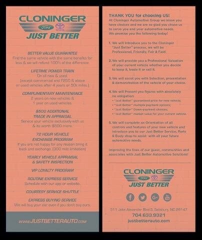 At Cloninger Ford of Morganton come see how we are your JUST BETTER dealership. We offer the following benefits: Better Value Guarantee,1st Year Maintenance, $500 Additional Trade In Appraisal, 72 Hour Vehicle Exchange Program, Yearly Vehicle Appraisal & Safety Inspection, VIP Loyalty Program, Routine Express Service, Courtesy Service Shuttle, Express Buying Service. Also, as an added benefit we will buy your vehicle even if you don't buy ours!! Call today (800)951-2277or visit us at www.cloningerfordofmorganton.com All pricing plus $799 appearance protection package and $899 documentation charge. All pricing includes discounts for dealer arranged financing. **Financing must be provided by a third-party lender using this dealership’s assistance for Customer to receive $1,000 Financing Assist credit that is included in the online price. See dealer for complete details One Year Cloninger Protection Package $1,299 Not Included In Sales Price *WINDSHIELD PROTECTION* *PAINT PROTECTION Protects against fading, weather induced cracking or peeling, oxidation or loss of gloss. *FABRIC PROTECTION Protects against any normal oil-or water-based spills on the fabric. *VINYL & LEATHER PROTECTION Protects against fading and permanent staining caused by food or drink.