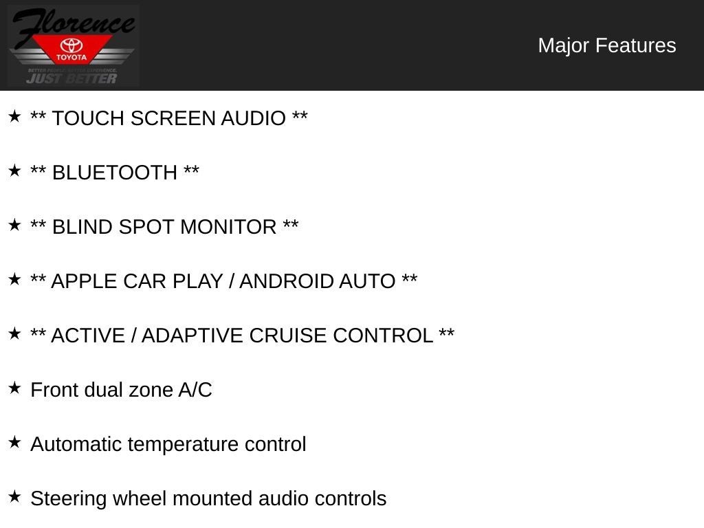 At Florence Toyota come see how our USED CARS are JUST BETTER . We offer the following benefits: Lifetime Power Train (Some exclusions apply), 1st Year Maintenance, $500 Additional Trade In Appraisal, 72 Hour Vehicle Exchange Program, Yearly Vehicle Appraisal & Safety Inspection, VIP Loyalty Program, Routine Express Service, Courtesy Service Shuttle, Express Buying Service. Also, as an added benefit we will buy your vehicle even if you don't buy ours!! Call today (866)830-0793 or visit us at www.florencetoyota.com *Customer must trade-in a vehicle to receive $1,000 Trade Assist credit that is included in the online price. **Financing must be provided by a third-party lender using this dealership's assistance for Customer to receive $1,000 Financing Assist credit that is included in the online price. See dealer for complete details.
