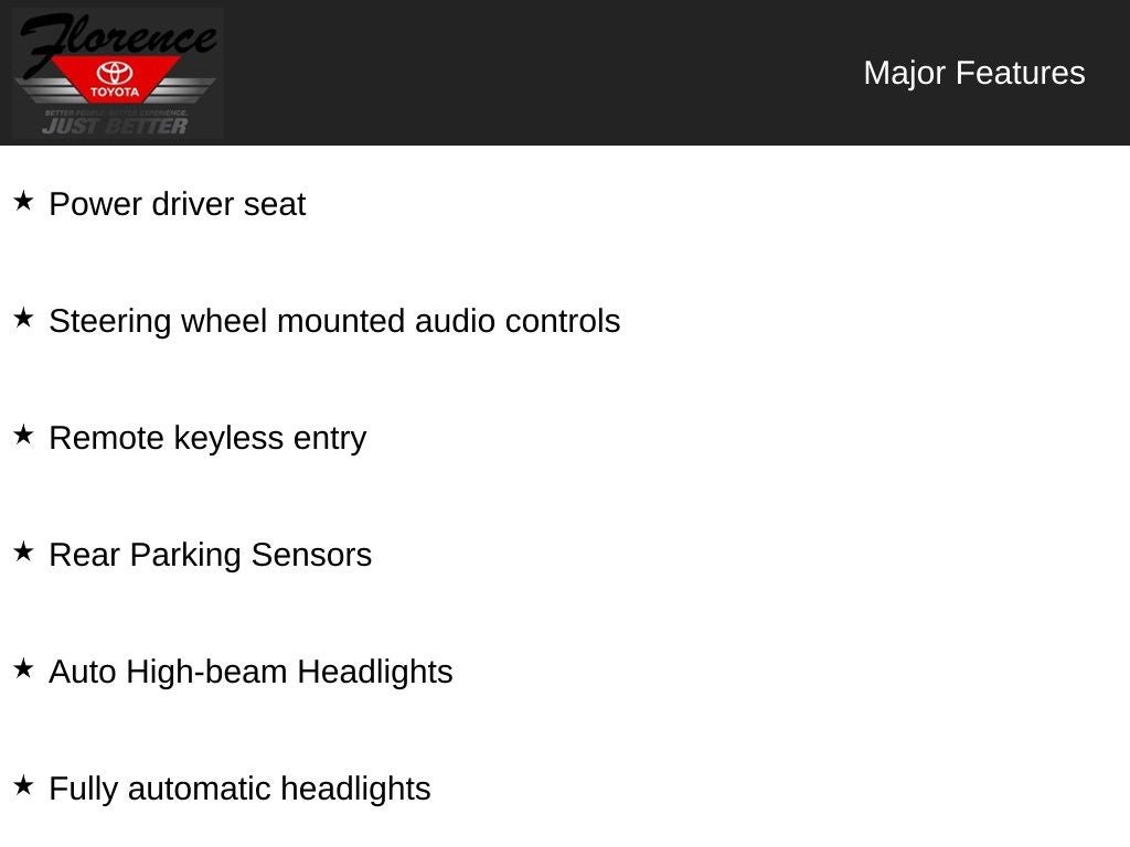 At Florence Toyota, come see how our USED CARS are JUST BETTER. We offer the following benefits: Lifetime Power Train (Some exclusions apply), 1st Year Maintenance, $500 Additional Trade In Appraisal, 72 Hour Vehicle Exchange Program, Yearly Vehicle Appraisal & Safety Inspection, VIP Loyalty Program, Routine Express Service, Courtesy Service Shuttle, Express Buying Service. Also, as an added benefit, we will buy your vehicle even if you don't buy ours!! Call today (866)830-0793 or visit us at www.florencetoyota.com *Customer must trade-in a vehicle to receive $1,000 Trade Assist credit that is included in the online price. **Financing must be provided by a third-party lender using this dealership's assistance for Customer to receive $1,000 Financing Assist credit that is included in the online price. See dealer for complete details.
