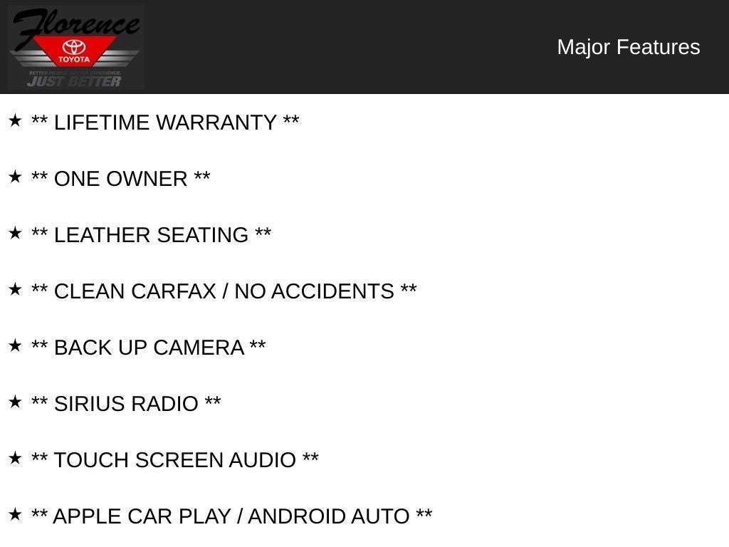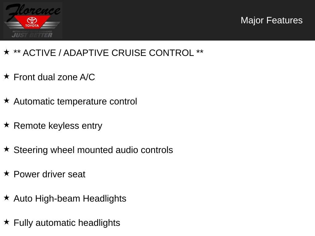 At Florence Toyota come see how our USED CARS are JUST BETTER . We offer the following benefits: Lifetime Power Train (Some exclusions apply), 1st Year Maintenance, $500 Additional Trade In Appraisal, 72 Hour Vehicle Exchange Program, Yearly Vehicle Appraisal & Safety Inspection, VIP Loyalty Program, Routine Express Service, Courtesy Service Shuttle, Express Buying Service. Also, as an added benefit we will buy your vehicle even if you don't buy ours!! Call today (866)830-0793 or visit us at www.florencetoyota.com *Customer must trade-in a vehicle to receive $1,000 Trade Assist credit that is included in the online price. **Financing must be provided by a third-party lender using this dealership's assistance for Customer to receive $1,000 Financing Assist credit that is included in the online price. See dealer for complete details.