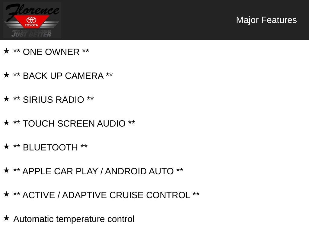 At Florence Toyota come see how our USED CARS are JUST BETTER. We offer the following benefits: Lifetime Power Train (Some exclusions apply), 1st Year Maintenance, $500 Additional Trade In Appraisal, 72 Hour Vehicle Exchange Program, Yearly Vehicle Appraisal & Safety Inspection, VIP Loyalty Program, Routine Express Service, Courtesy Service Shuttle, Express Buying Service. Also, as an added benefit we will buy your vehicle even if you don't buy ours!! Call today (866)830-0793 or visit us at www.florencetoyota.com *Customer must trade-in a vehicle to receive $1,000 Trade Assist credit that is included in the online price. **Financing must be provided by a third-party lender using this dealership's assistance for Customer to receive $1,000 Financing Assist credit that is included in the online price. See dealer for complete details.
