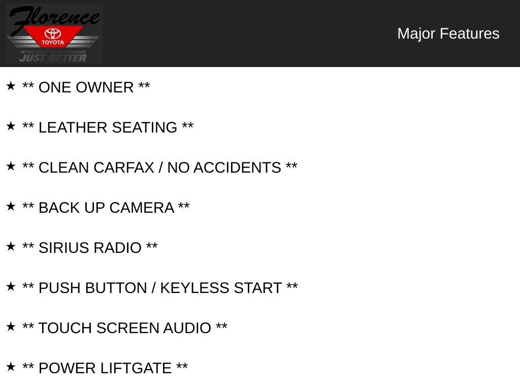 At Florence Toyota come see how our USED CARS are JUST BETTER. We offer the following benefits: Lifetime Power Train (Some exclusions apply), 1st Year Maintenance, $500 Additional Trade In Appraisal, 72 Hour Vehicle Exchange Program, Yearly Vehicle Appraisal & Safety Inspection, VIP Loyalty Program, Routine Express Service, Courtesy Service Shuttle, Express Buying Service. Also, as an added benefit we will buy your vehicle even if you don't buy ours!! Call today (866)830-0793 or visit us at www.florencetoyota.com *Customer must trade-in a vehicle to receive $1,000 Trade Assist credit that is included in the online price. **Financing must be provided by a third-party lender using this dealership's assistance for Customer to receive $1,000 Financing Assist credit that is included in the online price. See dealer for complete details.