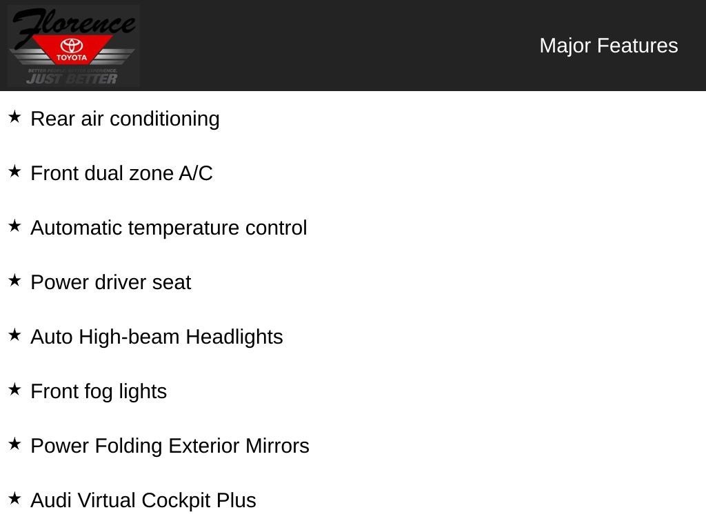 Convenience Package: Alarm System with Motion Sensors; Auto-Dimming Exterior Mirrors with Memory; SiriusXM with 360L; Audi Advanced Key; Audi Side Assist with Pre Sense Rear; Driver Seat Memory. Premium Plus: Wireless Phone Charging Pad; Power Folding Exterior Mirrors; Leatherette Covered Center Console and Door Armrests; 2 Rear USB Charge Ports; Top View Camera System; Bang & Olufsen Sound System with 3D Sound; Audi Virtual Cockpit Plus. **Equipment listed is based on original vehicle build and subject to change. Please confirm the accuracy of the included equipment by calling the dealer prior to purchase.**