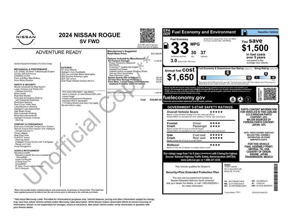 Protect this 2024 Nissan Rogue from unwanted accidents with a cutting edge backup camera system. This unit is pure luxury with a heated steering wheel. Apple CarPlay: Seamless smartphone integration for the vehicle - stay connected and entertained on the go! The state of the art park assist system will guide you easily into any spot. The leather seats in the Nissan Rogue are a must for buyers looking for comfort, durability, and style. This vehicle comes equipped with Android Auto for seamless smartphone integration on the road. Bluetooth® technology is built into this model, keeping your hands on the steering wheel and your focus on the road. This Nissan Rogue keeps you comfortable with Auto Climate. Never get into a cold vehicle again with the remote start feature on this small suv. This 2024 Nissan Rogue emanates grace with its stylish gray exterior. The vehicle has a 3 Cyl, 1.5L high output engine.