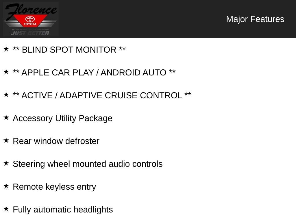 At Florence Toyota, come see how our USED CARS are JUST BETTER. We offer the following benefits: Lifetime Power Train (Some exclusions apply), 1st Year Maintenance, $500 Additional Trade In Appraisal, 72 Hour Vehicle Exchange Program, Yearly Vehicle Appraisal & Safety Inspection, VIP Loyalty Program, Routine Express Service, Courtesy Service Shuttle, Express Buying Service. Also, as an added benefit, we will buy your vehicle even if you don't buy ours!! Call today (866)830-0793 or visit us at www.florencetoyota.com *Customer must trade-in a vehicle to receive $1,000 Trade Assist credit that is included in the online price. **Financing must be provided by a third-party lender using this dealership's assistance for Customer to receive $1,000 Financing Assist credit that is included in the online price. See dealer for complete details.