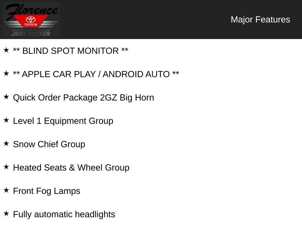 Quick Order Package 2GZ Big Horn. Level 1 Equipment Group: Google Android Auto; SiriusXM Radio Service; Bluetooth® Handsfree Phone and Audio; Integrated Center Stack Radio; For Details. Visit DriveUconnect.com; For More Info. Call 800-643-2112; Leather Wrapped Steering Wheel; Rear Dome with On/off Switch Lamp; Front Fog Lamps; Integrated Voice Command with Bluetooth®; Connectivity - US/Canada; Glove Box Lamp; Auto Power-Folding Mirrors; Footwell Courtesy Lamp; 4G LTE Wi-Fi Hot Spot; GPS Antenna Input; Exterior Mirrors with Heating Element; Global Telematics Box Module; Mirror Running Lights; Uconnect 5 W Radio with 8.4" Display; 8.4" Touchscreen Display; Foam Bottle Insert (door Trim Panel); Black Exterior Mirrors; 18" X 8.0" Polished Aluminum Wheels; Apple CarPlay; Big Horn Instrument Panel Badge; Power Adjustable Convex Aux Mirrors; Forward and Reverse Utility Lights; Locking Lower Glove Box; Selectable Tire Fill Alert; SiriusXM Satellite Radio; Power Heated Fold Telescope Mirrors; Exterior Mirrors with Supplemental Signals; Steering Wheel Mounted Audio Controls; Exterior Mirrors Courtesy Lamps; Dual Glove Boxes; Center Hub; Power Adjust Mirrors; 2nd Row in Floor Storage Bins; Power Telescoping Mirrors. Snow Chief Group: Clearance Lamps; LT275/70R18E OWL On/off Road Tires; Instrument Panel Mounted Auxiliary Switches; Anti-Spin Differential Rear Axle; Auxiliary Switches Prep; Transfer Case Skid Plate Shield. Heated Seats and Wheel Group: Heated Front Seats; Leather Wrapped Steering Wheel; Heated Steering Wheel; Steering Wheel Mounted Audio Controls. Blind Spot and Cross Path Detection. 5th Wheel/gooseneck Towing Prep Group. Anti-Spin Differential Rear Axle. LT275/70R18E OWL On/off Road Tires. Premium Cloth Bucket Seats. Remote Start System. Granite Crystal Met CC. Front Fog Lamps. Rear Wheelhouse Liners. Rear Window Defroster. MOPAR Front and Rear Rubber Floor Mats. Instrument Panel Mounted Auxiliary Switches. Tow Hooks. Clearance Lamps. **Equipment listed is based on original vehicle build and subject to change. Please confirm the accuracy of the included equipment by calling the dealer prior to purchase.**