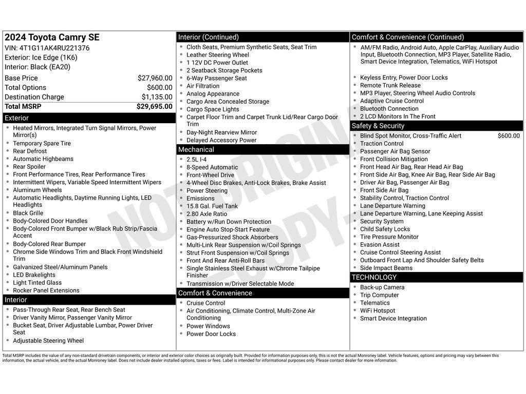 Just the right size to accommodate all your needs. It has room for passengers and plenty of trunk space. Our dealership has already run the CARFAX report and it is clean. A clean CARFAX is a great asset for resale value in the future. The leather seats in this vehicle are a must for buyers looking for comfort, durability, and style. With the adjustable lumbar support in this vehicle your back will love you. See what's behind you with the back up camera on this 2024 Toyota Camry . This unit features a hands-free Bluetooth® phone system. The vehicle comes equipped with Android Auto for seamless smartphone integration on the road. This model offers Apple CarPlay for seamless connectivity. The vehicle keeps you comfortable with Auto Climate. The vehicle's blind spot monitor enhances safety. The Toyota Camry warns of approaching vehicles with Cross-Traffic Alert.