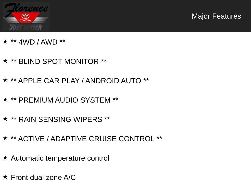 At Florence Toyota, come see how our USED CARS are JUST BETTER. We offer the following benefits: Lifetime Power Train (Some exclusions apply), 1st Year Maintenance, $500 Additional Trade In Appraisal, 72 Hour Vehicle Exchange Program, Yearly Vehicle Appraisal & Safety Inspection, VIP Loyalty Program, Routine Express Service, Courtesy Service Shuttle, Express Buying Service. Also, as an added benefit, we will buy your vehicle even if you don't buy ours!! Call today (866)830-0793 or visit us at www.florencetoyota.com *Customer must trade-in a vehicle to receive $1,000 Trade Assist credit that is included in the online price. **Financing must be provided by a third-party lender using this dealership's assistance for Customer to receive $1,000 Financing Assist credit that is included in the online price. See dealer for complete details.