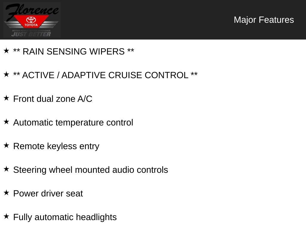 At Florence Toyota come see how our USED CARS are JUST BETTER. We offer the following benefits: Lifetime Power Train (Some exclusions apply), 1st Year Maintenance, $500 Additional Trade In Appraisal, 72 Hour Vehicle Exchange Program, Yearly Vehicle Appraisal & Safety Inspection, VIP Loyalty Program, Routine Express Service, Courtesy Service Shuttle, Express Buying Service. Also, as an added benefit we will buy your vehicle even if you don't buy ours!! Call today (866)830-0793 or visit us at www.florencetoyota.com *Customer must trade-in a vehicle to receive $1,000 Trade Assist credit that is included in the online price. **Financing must be provided by a third-party lender using this dealership's assistance for Customer to receive $1,000 Financing Assist credit that is included in the online price. See dealer for complete details.