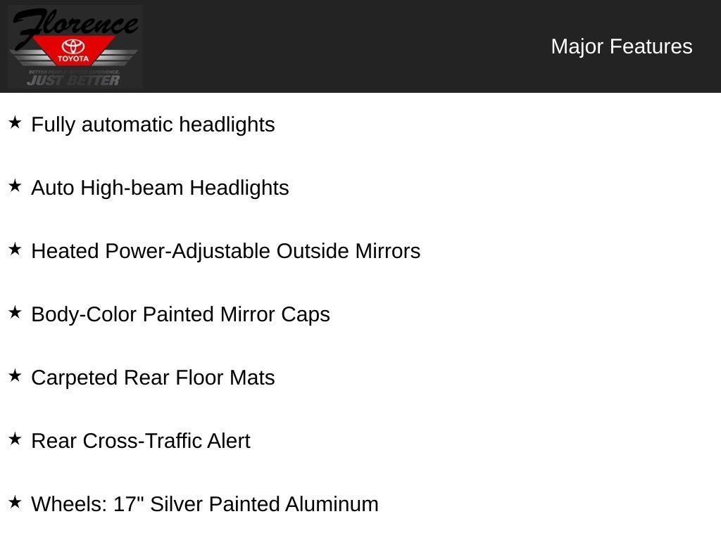 At Florence Toyota come see how our USED CARS are JUST BETTER . We offer the following benefits: Lifetime Power Train (Some exclusions apply), 1st Year Maintenance, $500 Additional Trade In Appraisal, 72 Hour Vehicle Exchange Program, Yearly Vehicle Appraisal & Safety Inspection, VIP Loyalty Program, Routine Express Service, Courtesy Service Shuttle, Express Buying Service. Also, as an added benefit we will buy your vehicle even if you don't buy ours!! Call today (866)830-0793 or visit us at www.florencetoyota.com *Customer must trade-in a vehicle to receive $1,000 Trade Assist credit that is included in the online price. **Financing must be provided by a third-party lender using this dealership's assistance for Customer to receive $1,000 Financing Assist credit that is included in the online price. See dealer for complete details.