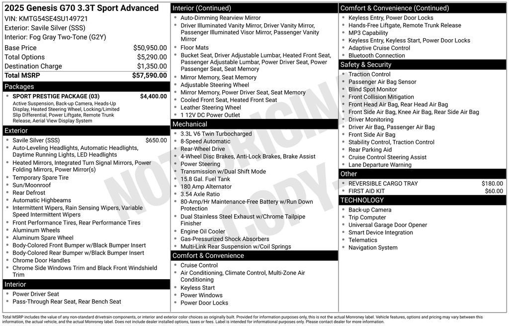 Certified as a one-owner vehicle with a clean CARFAX report, this 2025 Genesis G70 3.3T Sport Prestige is a rare find. Don't miss your opportunity to experience the ultimate in luxury and performance. Visit our showroom today and let us demonstrate why this remarkable vehicle is the perfect choice for you.