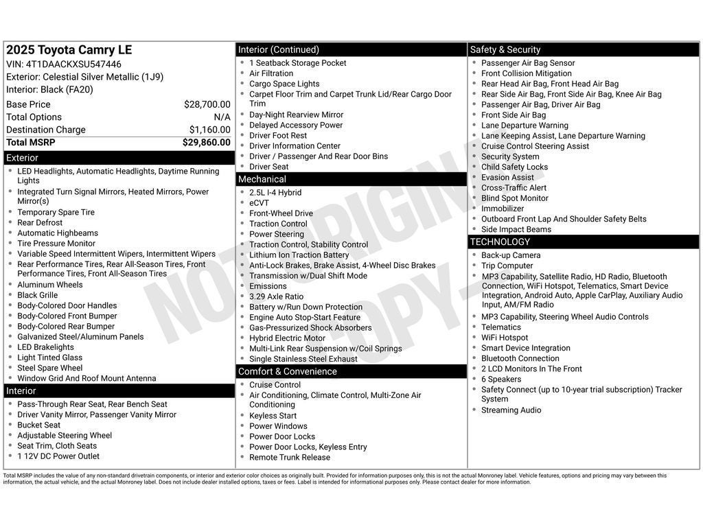 This Toyota Camry Hybrid LE combines reliability, efficiency, and modern convenience at the best price in the Florence, SC area. Don't miss the opportunity to own a like-new hybrid sedan with low miles, excellent fuel economy, and top safety features. Contact us today to schedule a test drive and see why this 2025 Toyota Camry Hybrid LE is the smart choice for drivers seeking value, comfort, and advanced hybrid performance. Act fast—quality vehicles at this price move quickly.