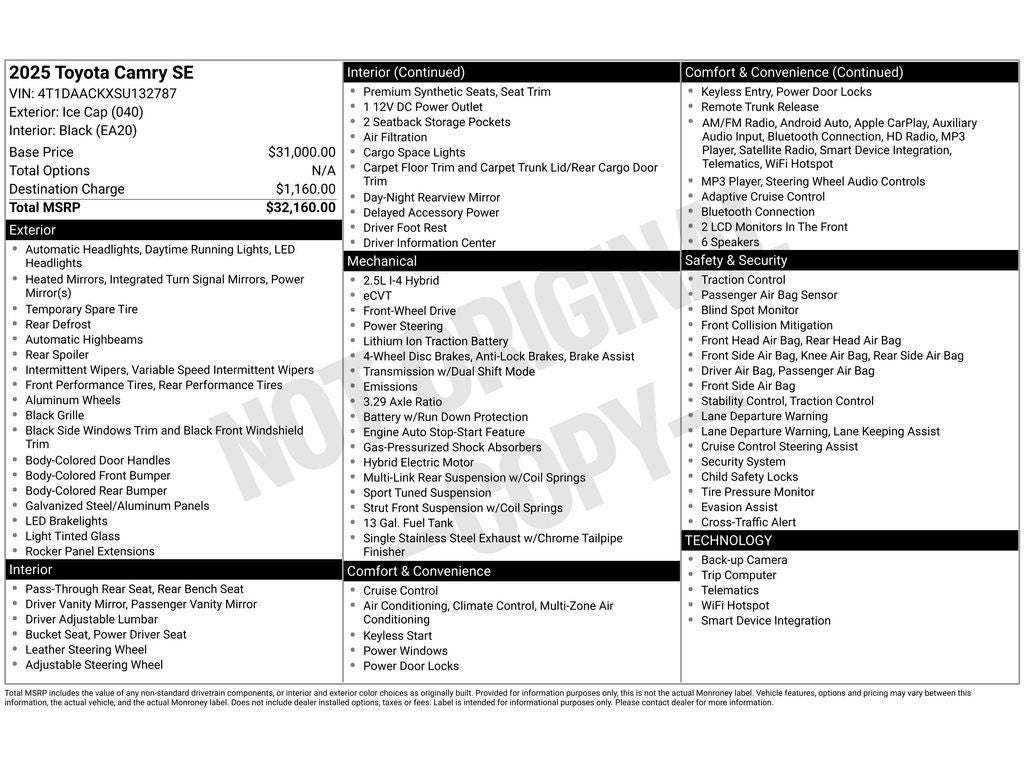 This unit offers Android Auto for seamless smartphone integration. Apple CarPlay: Seamless smartphone integration for this mid-size car - stay connected and entertained on the go! This 2025 Toyota Camry Hybrid keeps you comfortable with Auto Climate. See what's behind you with the back up camera on this unit. The vehicle enhances safety with a blind spot monitor, alerting drivers to potential dangers in adjacent lanes. This vehicle is a certified CARFAX 1-owner. This mid-size car has a clean CARFAX vehicle history report. Set the temperature exactly where you are most comfortable in the Toyota Camry Hybrid. The fan speed and temperature will automatically adjust to maintain your preferred zone climate. The vehicle warns of approaching vehicles with Cross-Traffic Alert. It features cruise control for long trips. Bluetooth® technology is built into the Toyota Camry Hybrid, keeping your hands on the steering wheel and your focus on the road. The leather seats in the Toyota Camry Hybrid are a must for buyers looking for comfort, durability, and style. Help alleviate lower back pain with the driver seat lumbar support in this 2025 Toyota Camry Hybrid .