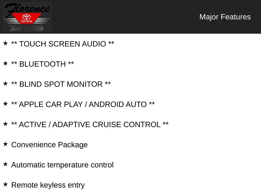 At Florence Toyota, come see how our USED CARS are JUST BETTER. We offer the following benefits: Lifetime Power Train (Some exclusions apply), 1st Year Maintenance, $500 Additional Trade In Appraisal, 72 Hour Vehicle Exchange Program, Yearly Vehicle Appraisal & Safety Inspection, VIP Loyalty Program, Routine Express Service, Courtesy Service Shuttle, Express Buying Service. Also, as an added benefit we will buy your vehicle even if you don't buy ours!! Call today (866)830-0793 or visit us at www.florencetoyota.com *Customer must trade-in a vehicle to receive $1,000 Trade Assist credit that is included in the online price. **Financing must be provided by a third-party lender using this dealership's assistance for Customer to receive $1,000 Financing Assist credit that is included in the online price. See dealer for complete details.