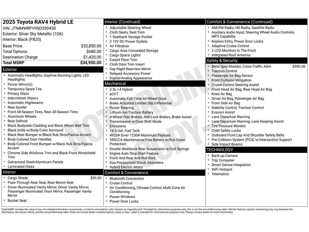 Bluetooth® technology is built into this Toyota RAV4 Hybrid, keeping your hands on the steering wheel and your focus on the road. Protect the Toyota RAV4 Hybrid from unwanted accidents with a cutting edge backup camera system. This Toyota RAV4 Hybrid has a clean CARFAX vehicle history report. This model offers Automatic Climate Control for personalized comfort. This 2025 Toyota RAV4 Hybrid 's Cross-Traffic Alert: Safeguarding you from unexpected traffic when reversing. This model's blind spot monitor enhances safety. Conquer any rainy, snowy, or icy road conditions this winter with the all wheel drive system on this unit. The vehicle has a 4 Cyl, 2.5L high output engine. This vehicle shines with an exquisite metallic silver exterior finish. Maintaining a stable interior temperature in this unit is easy with the climate control system. The Electronic Stability Control will keep you on your intended path. This vehicle features cruise control for long trips.